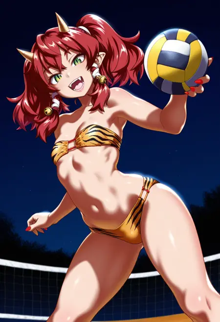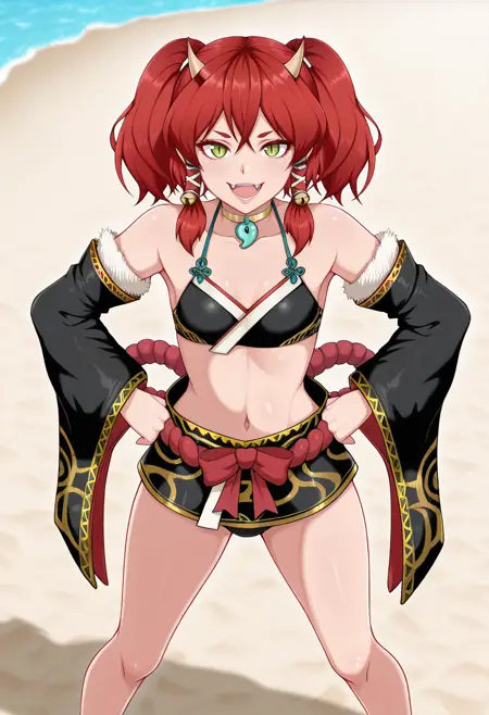 doaKnn, 1girl, solo, oni, horns, red hair, twintails, sidelocks, hair tubes, bell, green eyes, slit pupils, lips, small breasts, red nails,