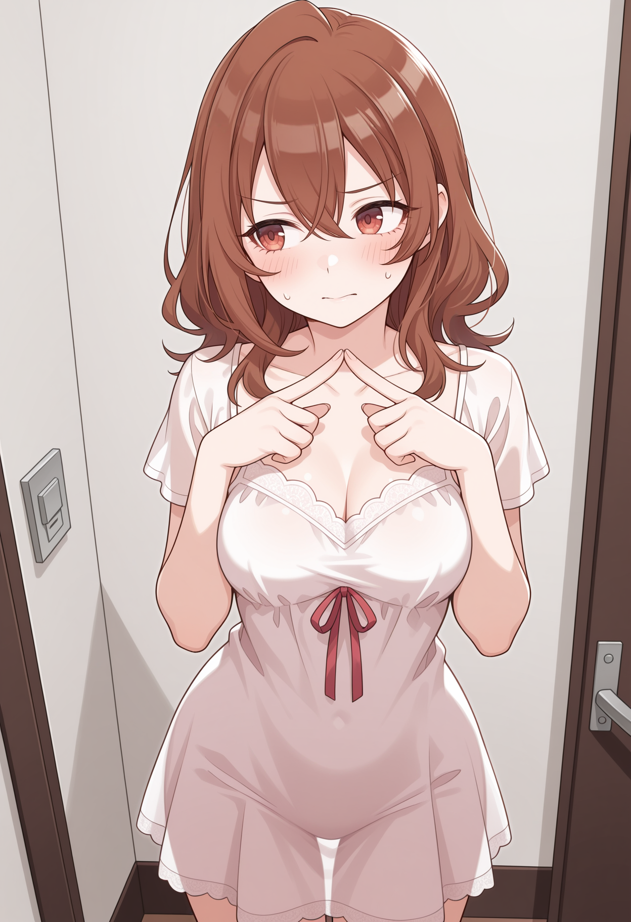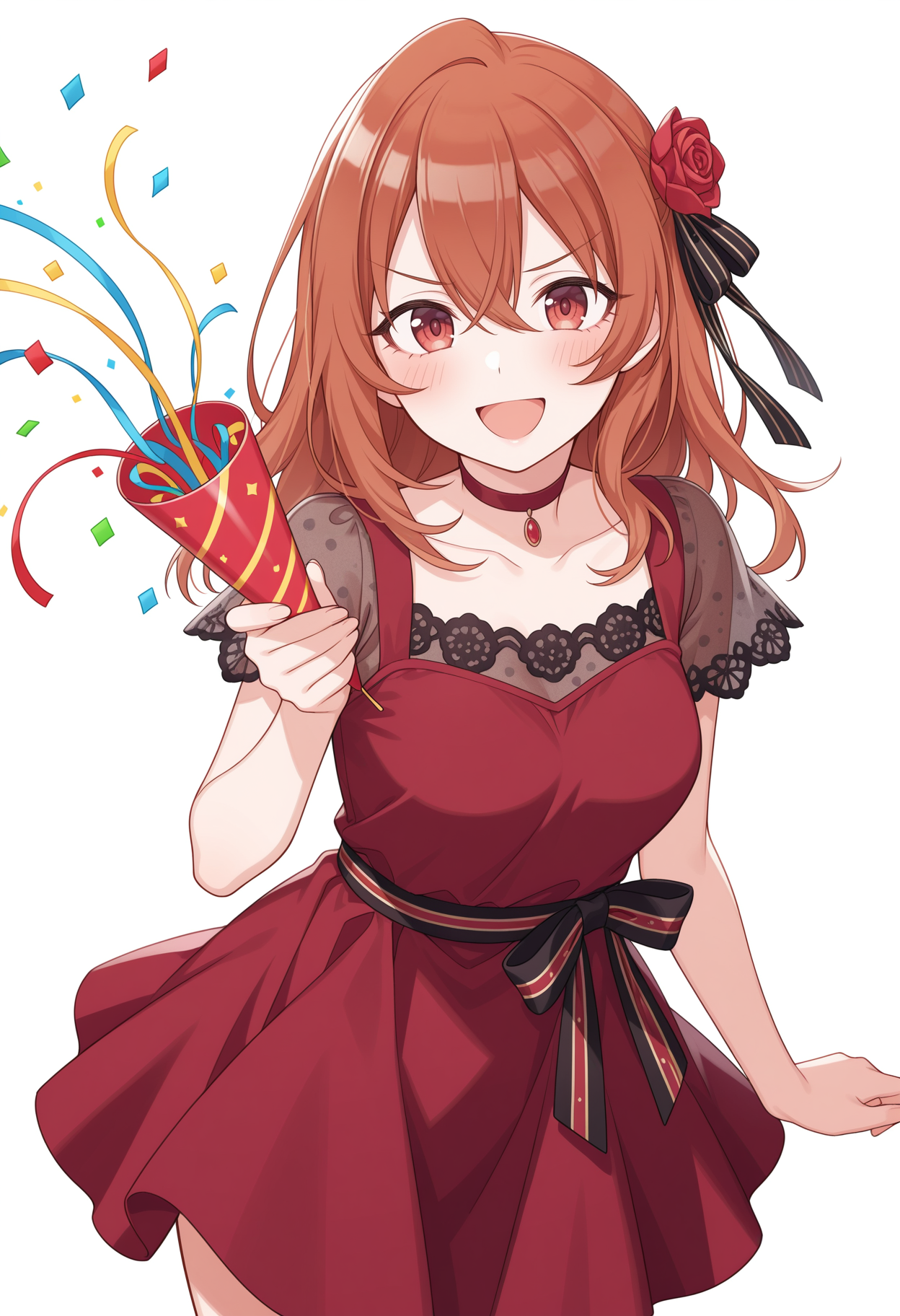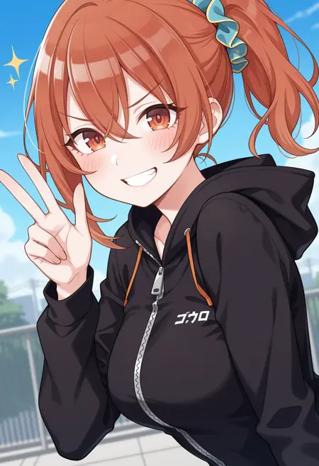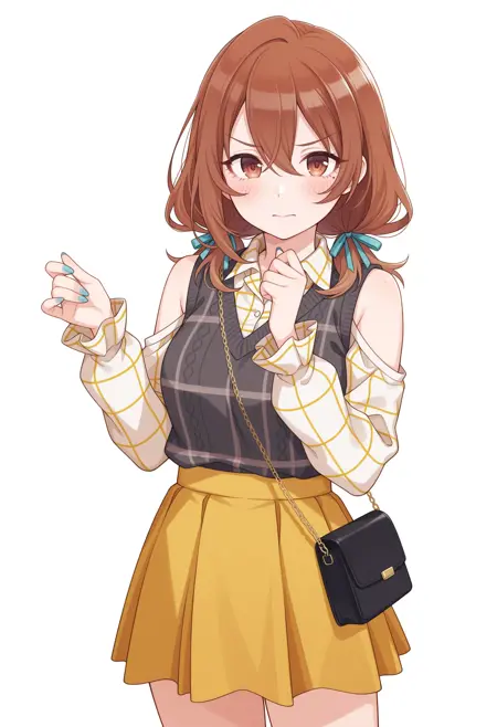 1girl, brown eyes, orange hair, medium hair, crossed bangs, hair between eyes,