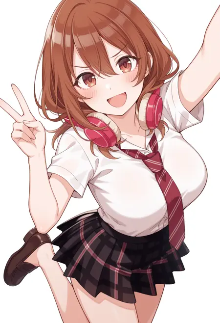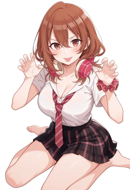 1girl, brown eyes, orange hair, medium hair, crossed bangs, hair between eyes, headphones around neck, dress shirt, short sleeves, red necktie, diagonal-striped necktie, pleated skirt, plaid skirt, miniskirt, black skirt, wrist scrunchie, blue scrunchie,