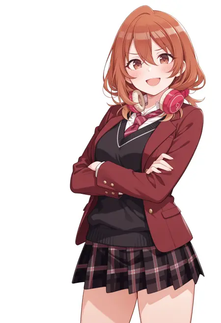 1girl, brown eyes, orange hair, medium hair, crossed bangs, hair between eyes, headphones around neck, dress shirt, red necktie, diagonal-striped necktie, sweater vest, red jacket, sleeves past wrist, pleated skirt, plaid skirt, miniskirt, black skirt, kneehighs, black socks
