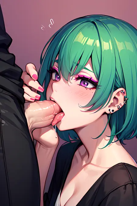 Proms: a girl with green hair playing with a cock, piercing, 1girl, grabbing testicles, hetero, 1boy, cum, green hair, licking, uncensored, purple eyes, blush, ejaculation, makeup, nose piercing, licking penis, ear piercing, solo focus, oral, tongue, nail polish, saliva, fellatio, lipstick, tongue piercing