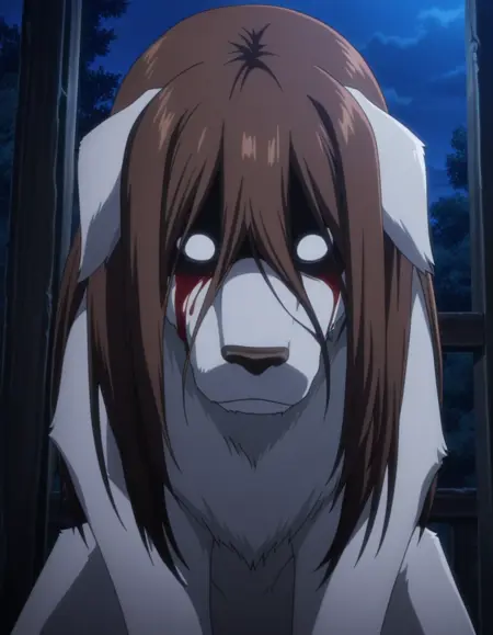 空洞的眼睛,棕色长发,苍白的白色毛发