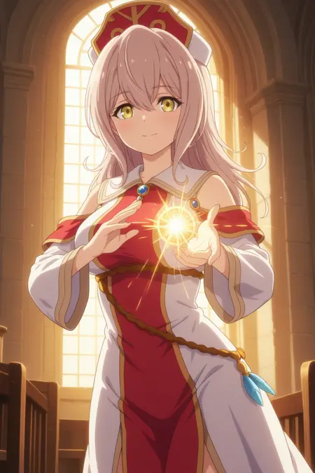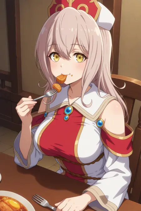 aalumachina, 黄色眼睛, 铂金色头发, 头发位于眼睛之间, 神职人员长裙, 帽子, 多色裙子, 红色裙子, 白色裙子, 有领裙子, 分离袖子, 白色袖子, 长袖, 绳子, 胸下, 蓝色胸针,