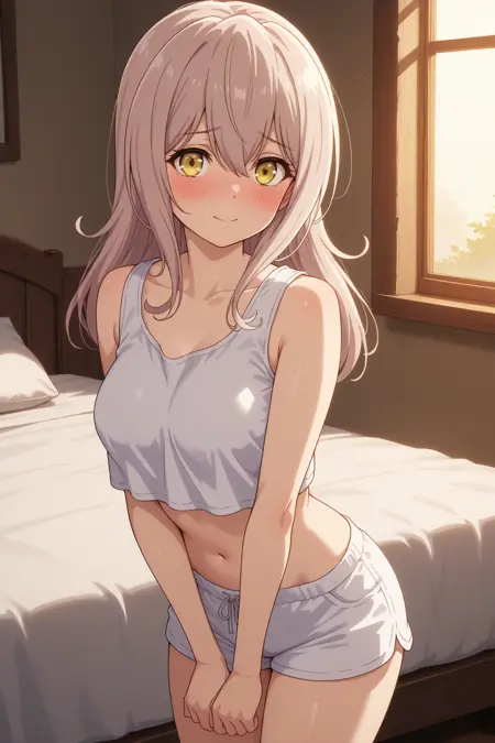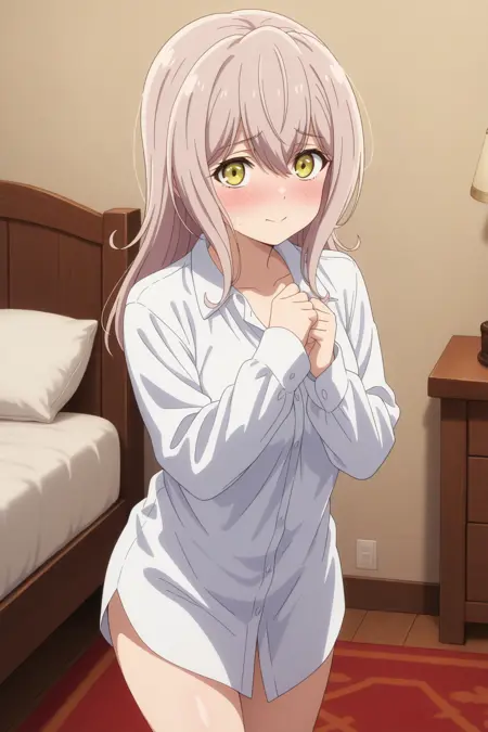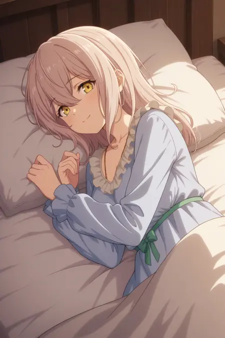 aalumachina, 黄色眼睛, 铂金色头发, 头发位于眼睛之间, lumachinasleep, 睡衣, 蓝色睡裙, 荷叶边睡裙, 荷叶边领子, 绿色丝带, 胸下, 长袖, 项链,