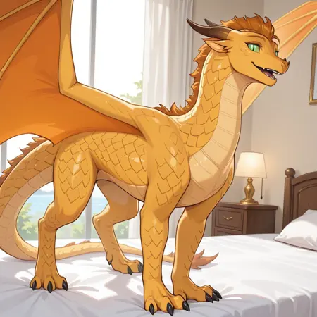 추가 프롬프트: Sandwing_wof, 드래곤, 갈색 뿔, 발톱, 꼬리, 금색 비늘, 연한 노랑색 배, 갈색 등 털, 작은 코 스파이크, 주황색 날개, 녹색 홍채, 검은 빗살눈동자, 1girl, 여성