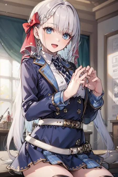 制服、ダブルブレスト、白いシャツ、黒いネクタイ、青いジャケット、太ももストラップ、黒いタイツ、ストライプ、青いスカート、プリーツスカート、緩いベルト、白いベルト、イヤリング、