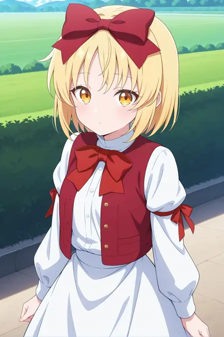 mugetsu, yellow eyes, blonde hair, short hair, small breasts, hair bow, red bow, red bowtie, red vest, open vest, white shirt, puffy long sleeves, sleeve ribbon, white skirt,