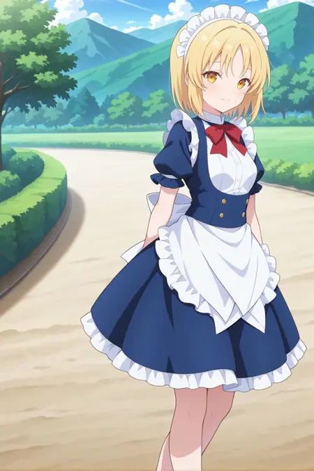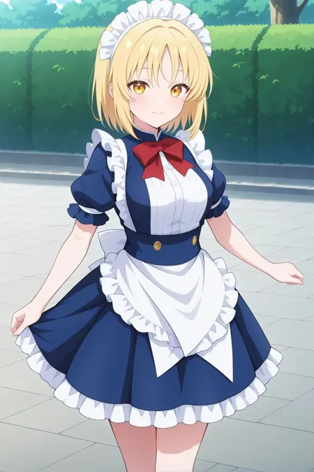 maid headress, red bowtie, blue dress, puffy short sleeves, frilled apron, waist apron, white apron,