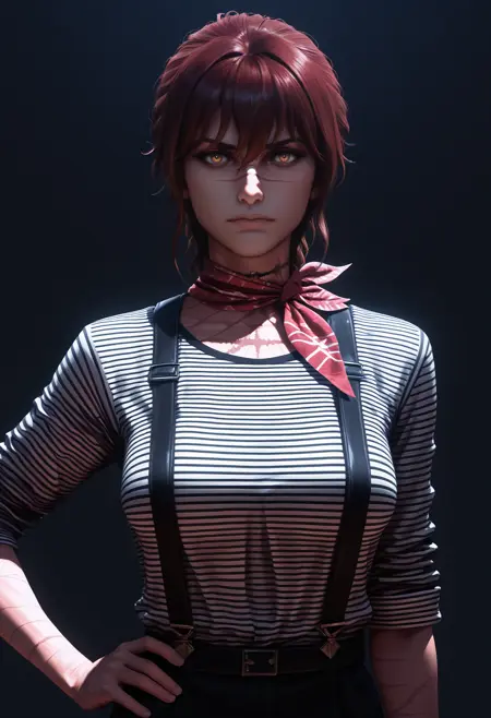 服装は「チョーカー、ジャケット、へその穴、ブレスレット、フィンガーレスグローブ、ベルト、パンツ、靴」です。