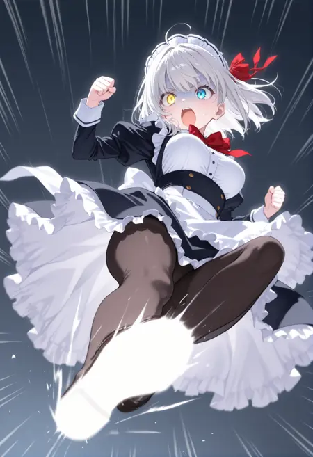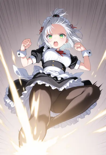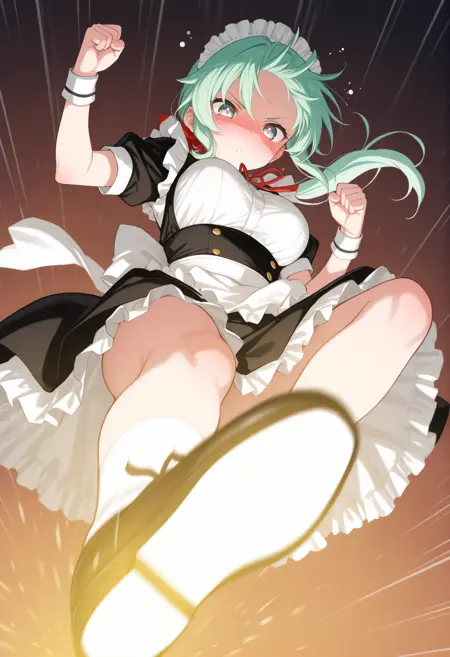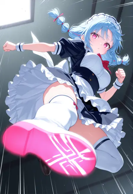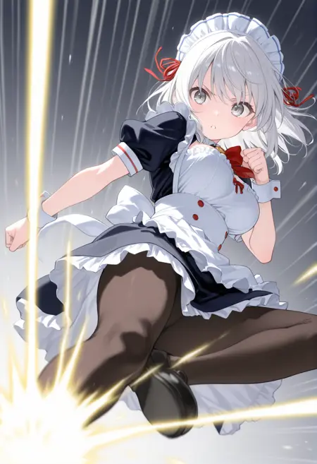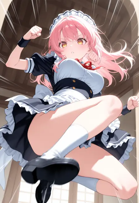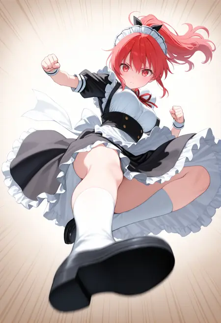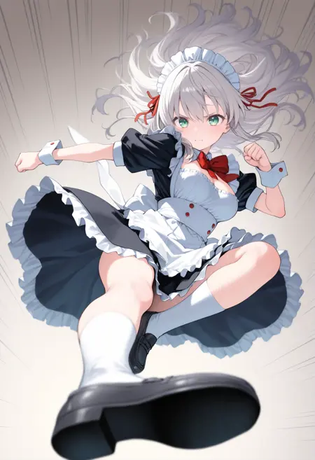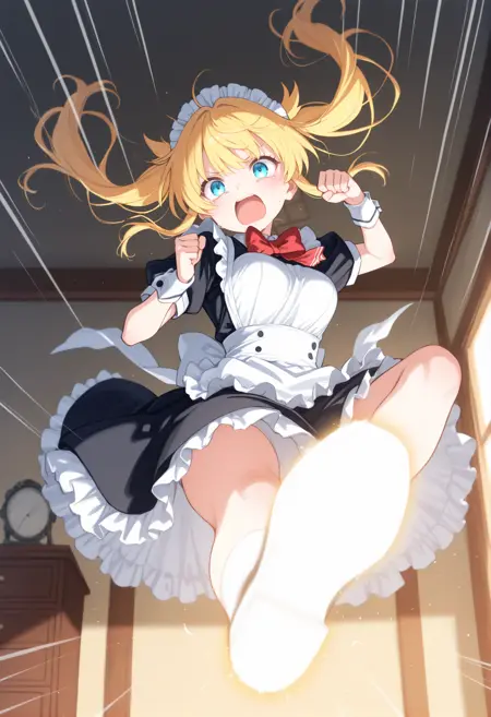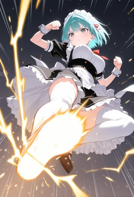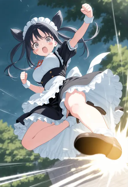 트리거 단어만으로도 그럴듯한 포즈를 취할 수 있지만, 역동감과 효과를 추가하고 싶다면 “flying kick”, “kicking”, “jumping”, “emphasis lines”, “incoming attack”, “flying”, “motion lines”, “motion blur”와 더불어 “lightning”, “sparks”, “fire”, “glowing”, “explosion” 같은 특수 기술처럼 보이는 프롬프트를 추가하세요.
