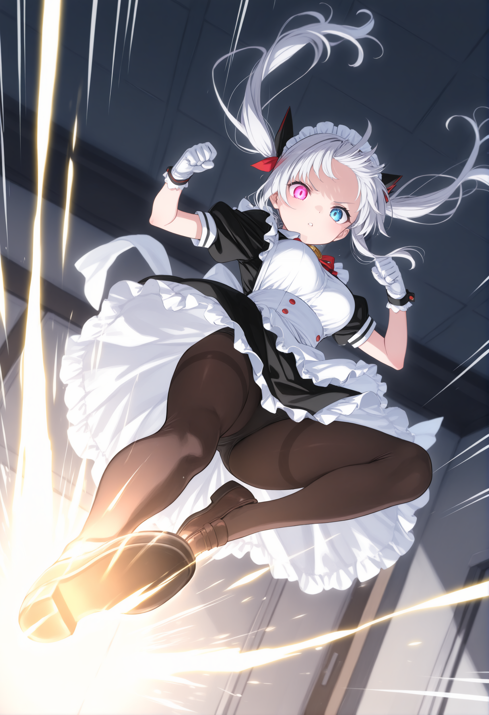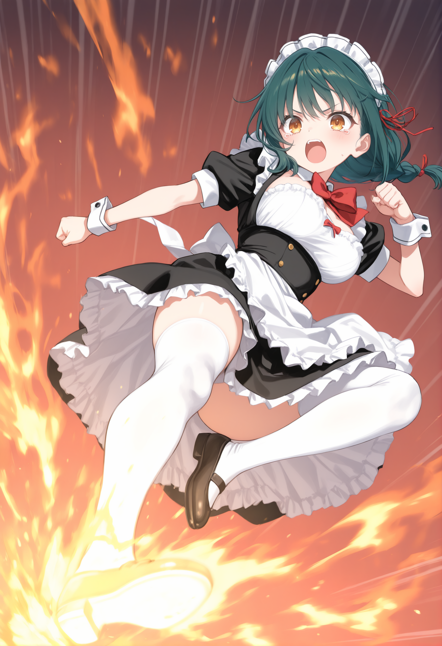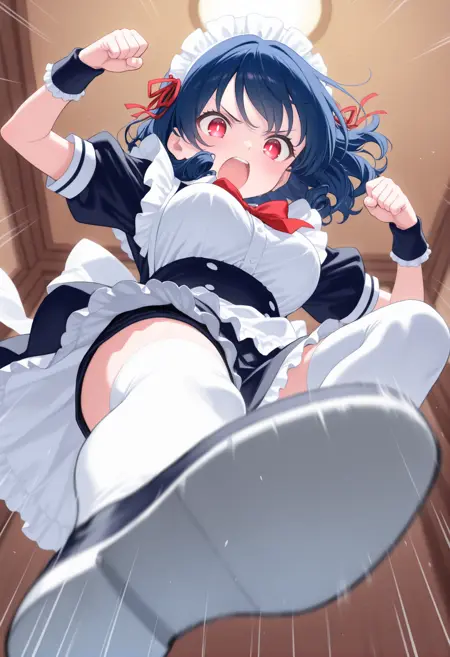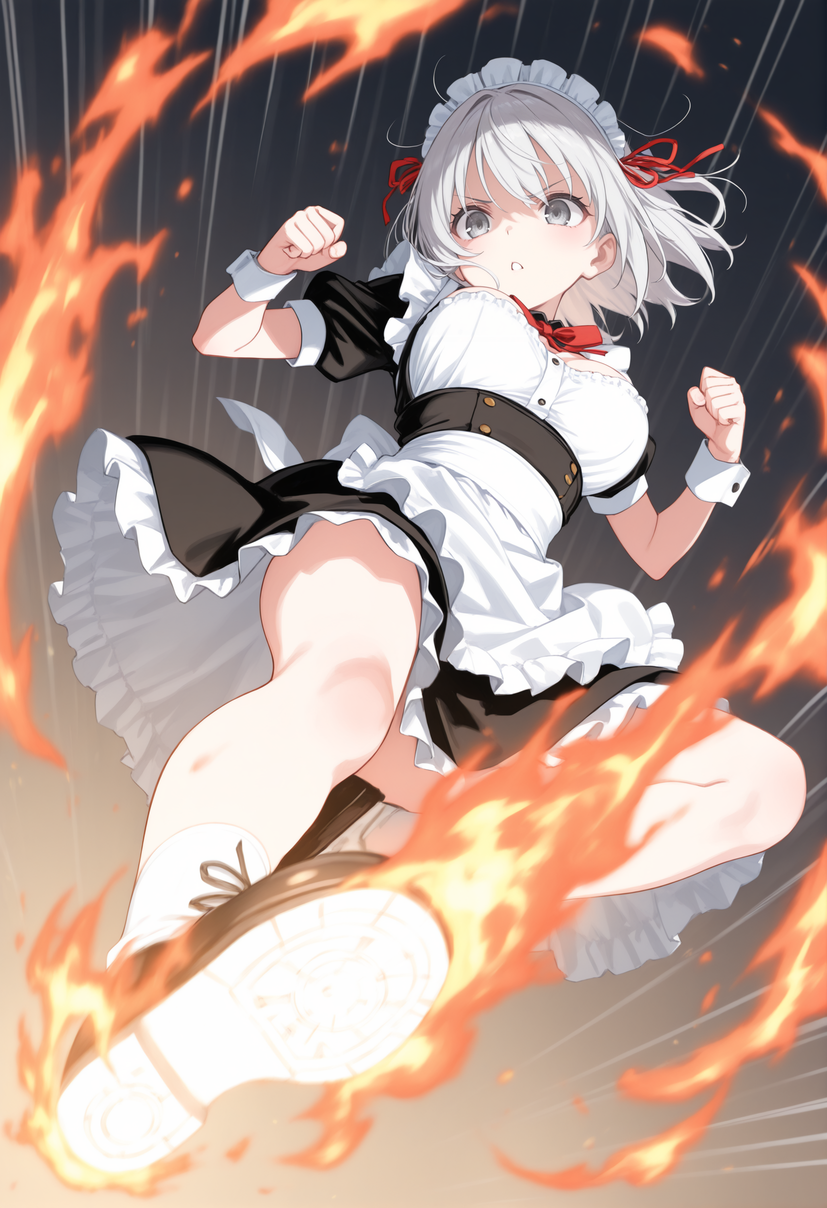 트리거 단어만으로도 그럴듯한 포즈를 취할 수 있지만, 역동감과 효과를 추가하고 싶다면 “flying kick”, “kicking”, “jumping”, “emphasis lines”, “incoming attack”, “flying”, “motion lines”, “motion blur”와 더불어 “lightning”, “sparks”, “fire”, “glowing”, “explosion” 같은 특수 기술처럼 보이는 프롬프트를 추가하세요.