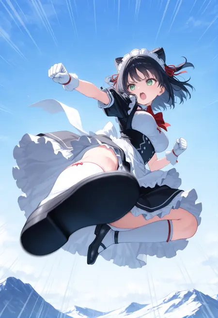이 LoRA는 가면라이더 시리즈에서 자주 사용되는 큰 점프 후 날아차기를 구사합니다.