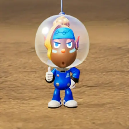 shepherd_\(pikmin\), 1girl, solo, dark-skinned_female, blue_eyes, eye_black, pointy_ears, blonde_hair, short_hair, asymmetrical_bangs, long_bangs, single_hair_bun, headband, mini_person, white_gloves, white_shoes, spacesuit, backpack, space_helmet, radio_antenna, whistle, tomboy,