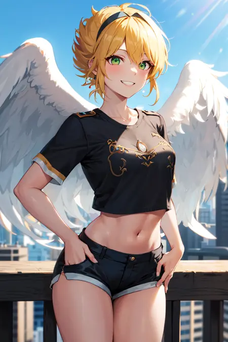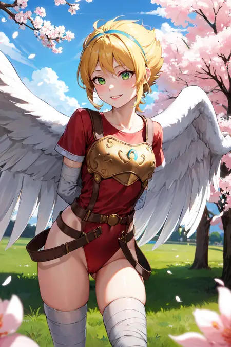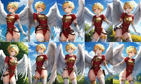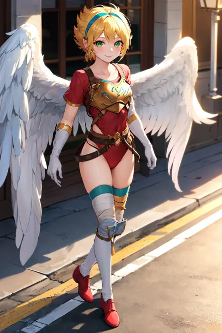 outfit1aanina, short hair, blonde hair, blue hairband, green eyes, feathered wings, breastplate, red leotard, short sleeves, elbow gloves, white gloves, belt, bandaged leg