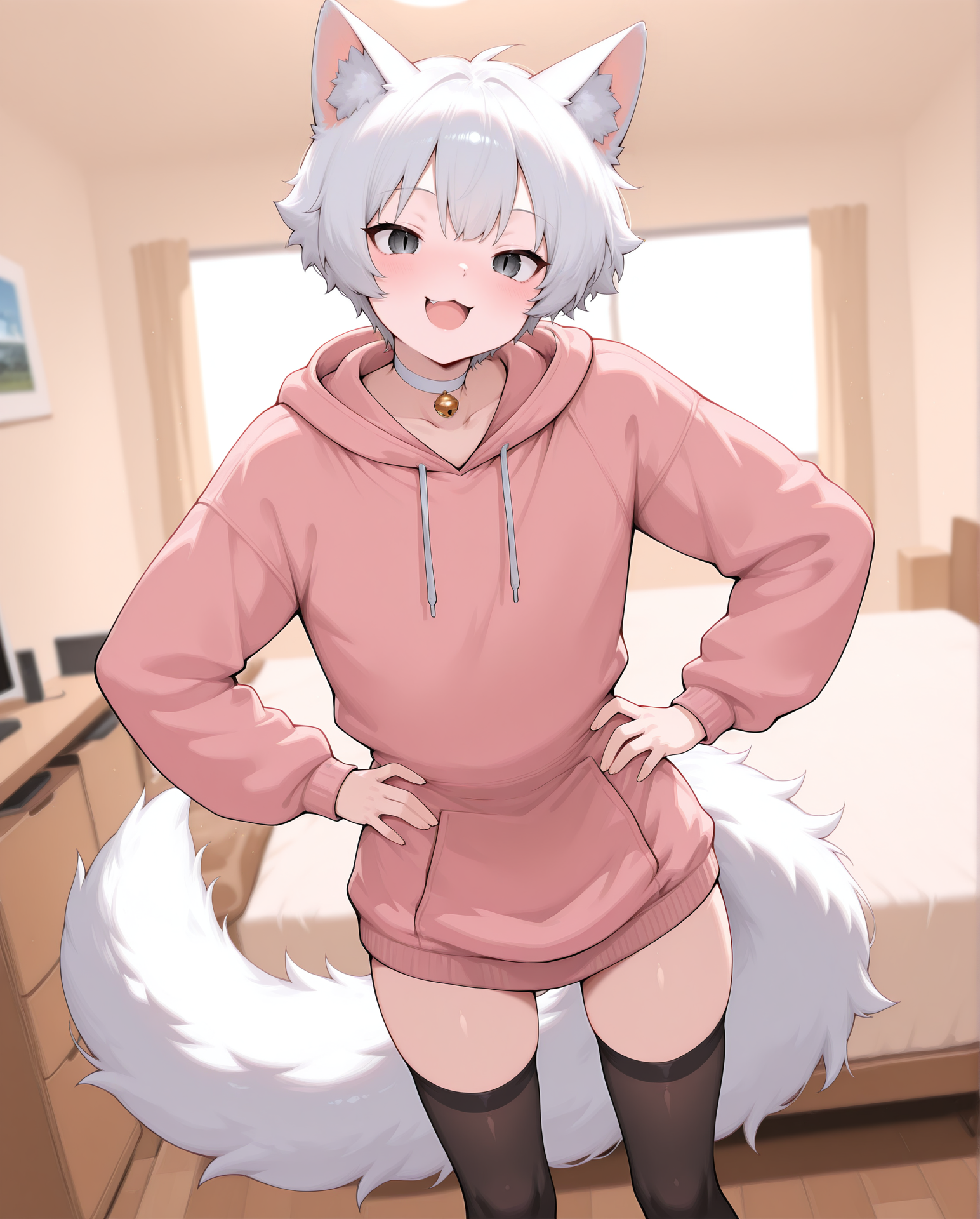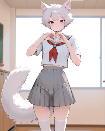 트리거: 1boy, solo, male focus, otoko no ko, white hair, short hair, hair between eyes, grey eyes, slit pupils, cat ears, animal ears, animal ear fluff, cat tail, fluffy tail, cat boy, :3,
