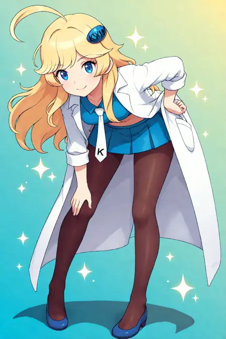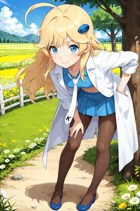 clkymmi, blonde hair, long hair, ahoge, bangs, hair ornament, blue crop top, white necktie, labcoat, open coat, three-quarter sleeves, sleeves rolled up, midriff, pleated skirt, blue skirt, miniskirt, brown pantyhose, flats, blue footwear