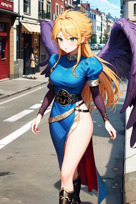 outfit1aanina, long hair, blonde hair, green eyes, feathered wings, blue dress, puffy sleeves, arm guards, bridal gauntlets, black belt, side slit