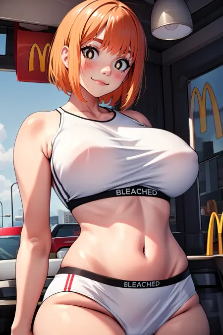 Basic prompt: 1girl,(solo:1.25),black eyes,white pupils,bob cut,orange hair
