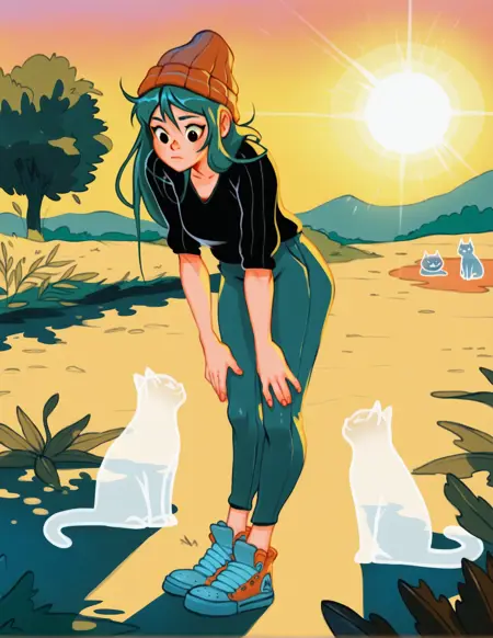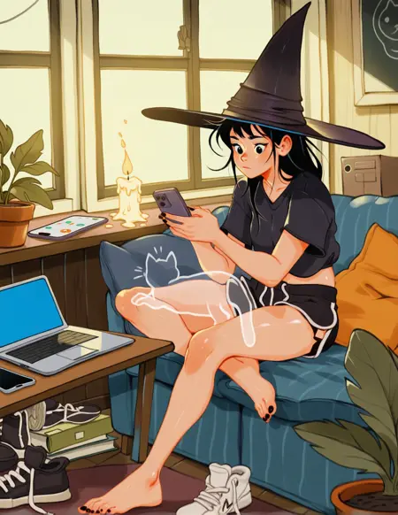 s1mz, 1girl, witch hat, barefoot, hat, indoors, laptop, shorts, book, cat, phone, plant, black hair, window, unworn shoes, computer, sitting, shoes, dolphin shorts, solo, cup, candle, witch, holding, black shorts, smartphone, black nails, toenails, cellphone, nail polish, potted plant