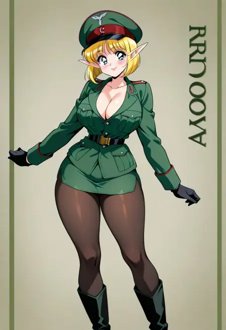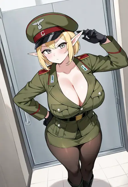 large breasts, pantyhose, thick thighs, green military general hat, green military army uniform, green miniskirt, blonde hair, short hair, elf, gray eyes, cleavage, belt, black boots, black arms, black gloves