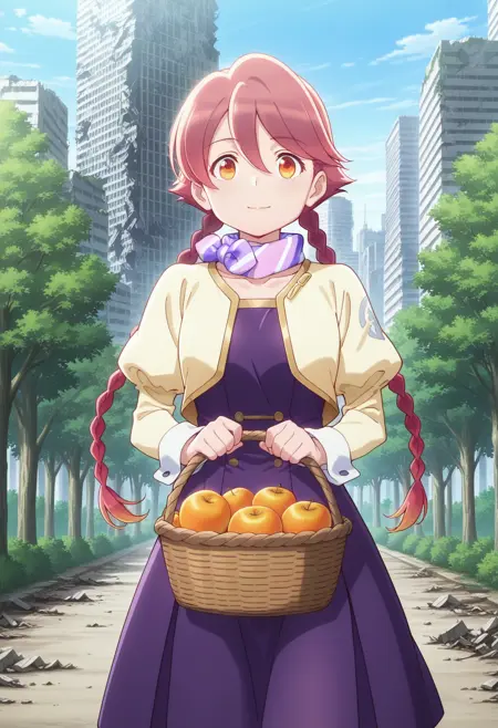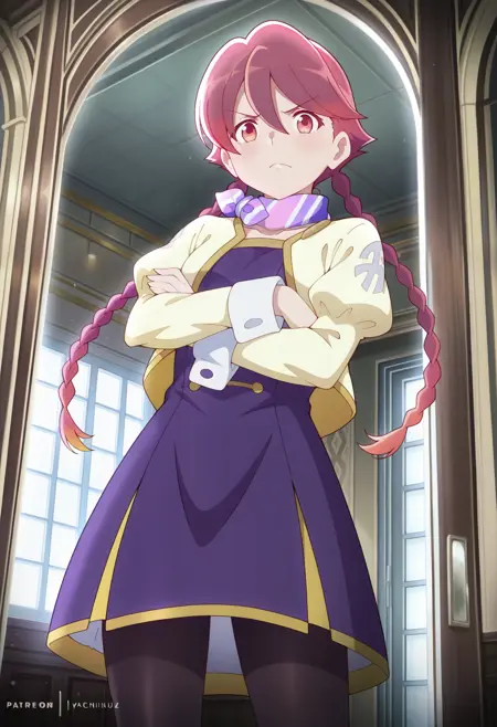 yachiyowz, red hair, long hair, twin braids, hair between eyes, gradient hair, orange eyes, scarf, multicolored scarf, striped scarf, purple dress, yellow jacket, cropped jacket, long sleeves, juliet sleeves, black pantyhose