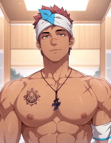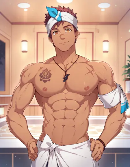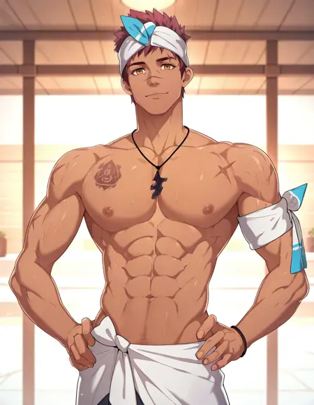 black pendant necklace, two-tone headband, topless male, two-tone sarong, two-tone armband, single pectoral tattoo, single bracelet, single anklet, barefoot