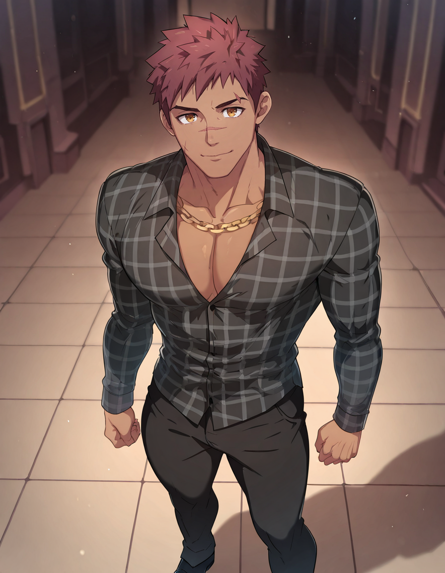 black patterned shirt, long sleeves, untucked shirt, pectoral cleavage, gold chain, black pants, black shoes