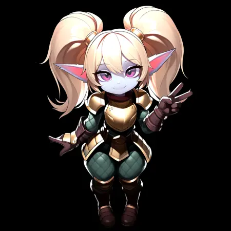 poppypoppy,colored skin,long_hair, twintails,purple_eyes, pointy ears blonde_hair,