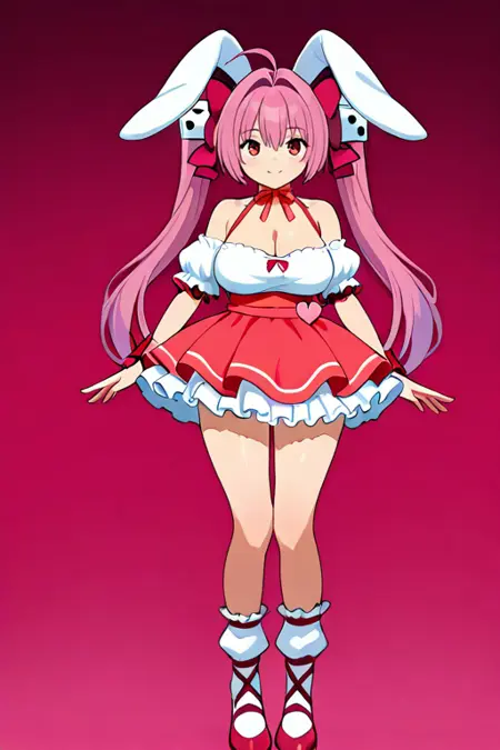 1girl, solo, hikaru_usada, twintails, pink hair, hair bow, dice hair ornaments, ahoge, red eyes, rabbit ears,
