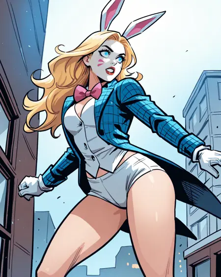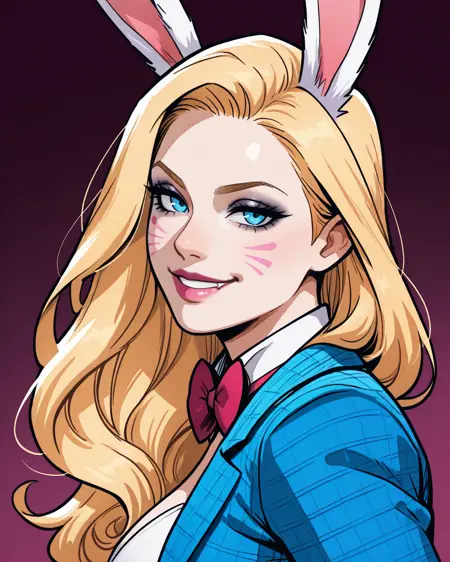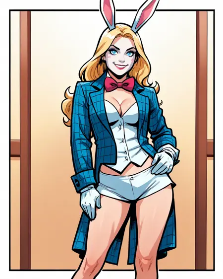 トリガー: whiterabbit, long hair, blonde hair, blue eyes, rabbit ears, makeup, bowtie, waistcoat, tailcoat, white gloves, underwear, shorts,