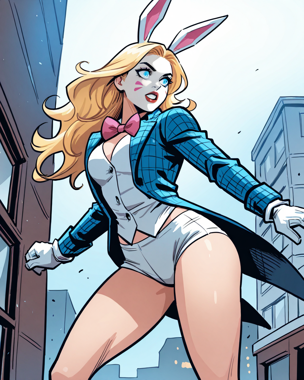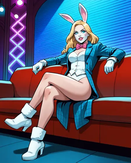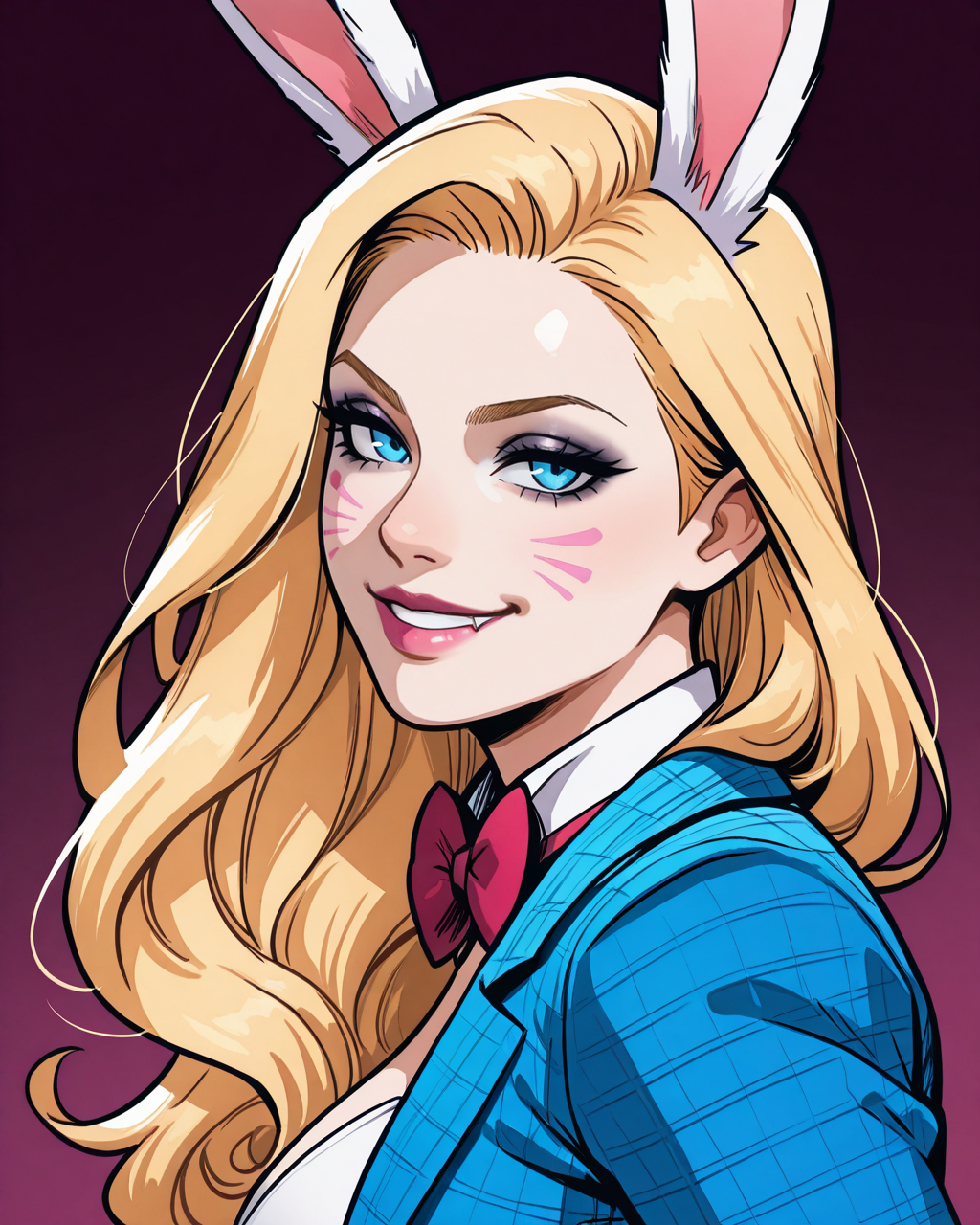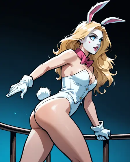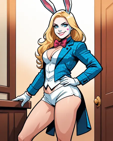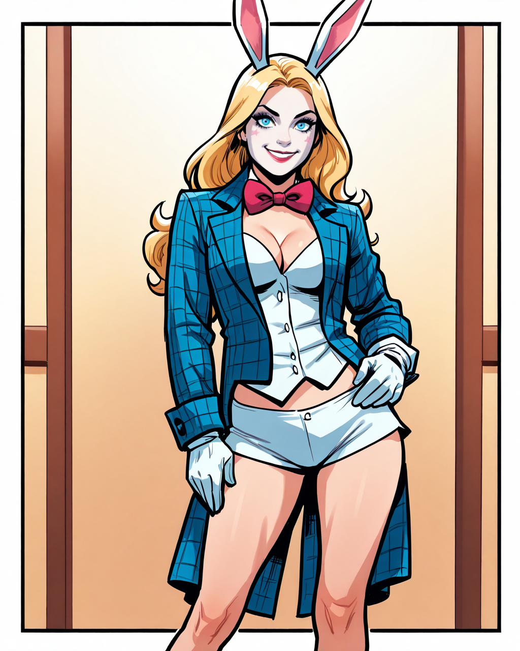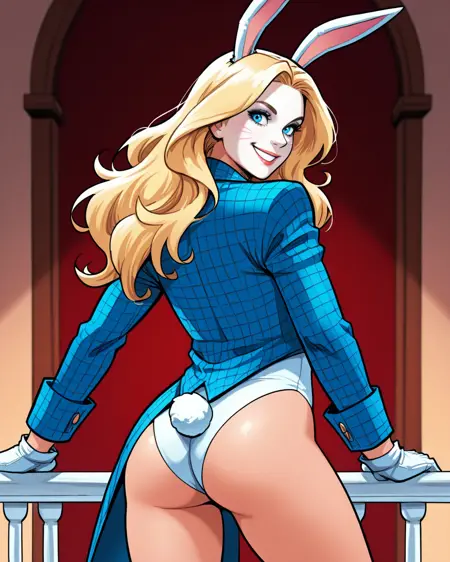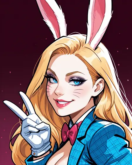 트리거: whiterabbit, 긴 머리, 금발, 파란 눈, 토끼 귀, 메이크업, 나비 넥타이, 고운 조끼, 테일코트, 흰 장갑, 속옷, 단축 바지