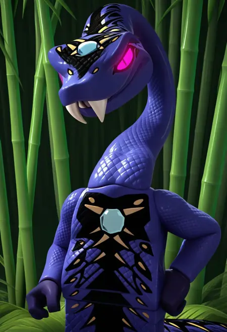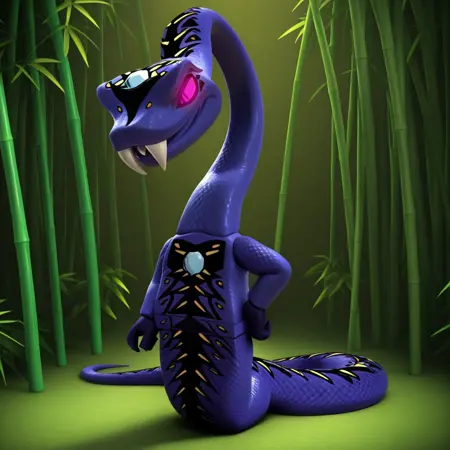 原版:Pythor_P_Chumsworth,serpentine,蛇,蛇尾,长尾,无腿,apode,紫色鳞片,头部有浅蓝色宝石,胸部有浅蓝色宝石,长颈,黑黄相间的身体纹路,复杂的身体纹路,头部纹路,腹部纹路,尾部纹路,尖牙,两颗大獠牙,发光的眼睛,热粉红色巩膜,黑色瞳孔,黑色眼影,深紫色手掌