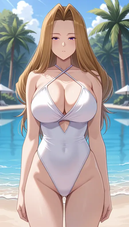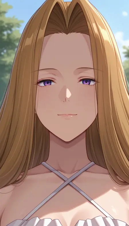 全体:メトード、薄茶色の髪、紫の目、長い髪、分け目のある前髪、額