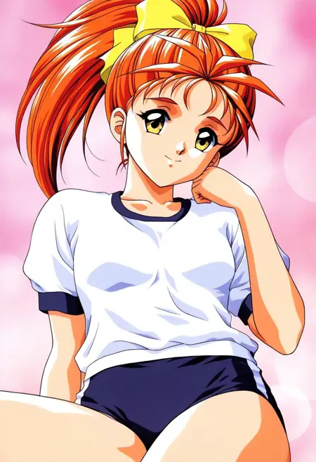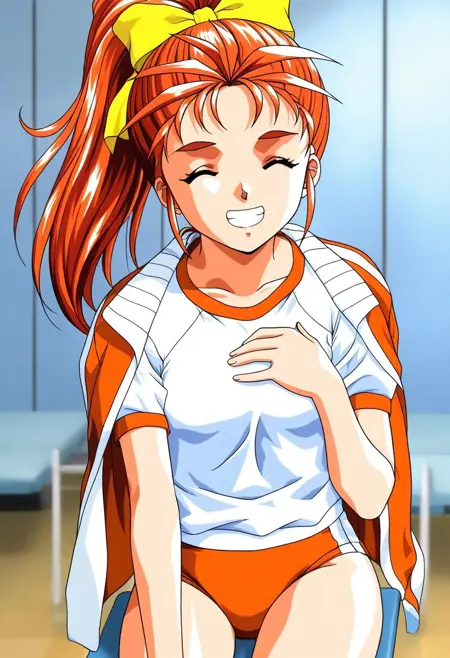 Saotome_Yumi, 1girl, 갈색 눈, 주황색 머리, 헤어리본, 높은 토끼꼬리, 긴 머리, 작은 가슴,