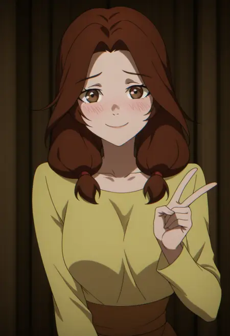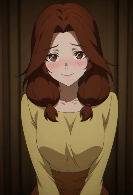 트리거 = zzalicezz, 태그 = 1girl, 갈색 머리카락, 긴 머리카락, 혼자, 셔츠, 갈색 눈, 미소, 긴 소매, 치마, 시청자 바라보기, 더블테일, 노란 셔츠, 쇄골, 애니메이션 컬러링, 상체, 가슴, 뺨红,