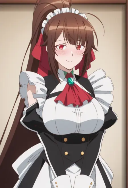 トリガー = zzamagizz、タグ = 1girl, brown hair, solo, maid, long hair, maid headdress, ponytail, ahoge, smile, bangs, apron, red eyes, breasts, looking at viewer, anime coloring, hair ribbon, ribbon, large breasts, very long hair, red ascot, dress,