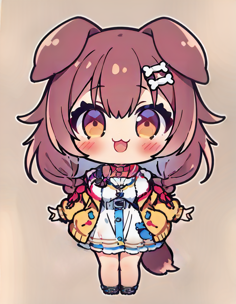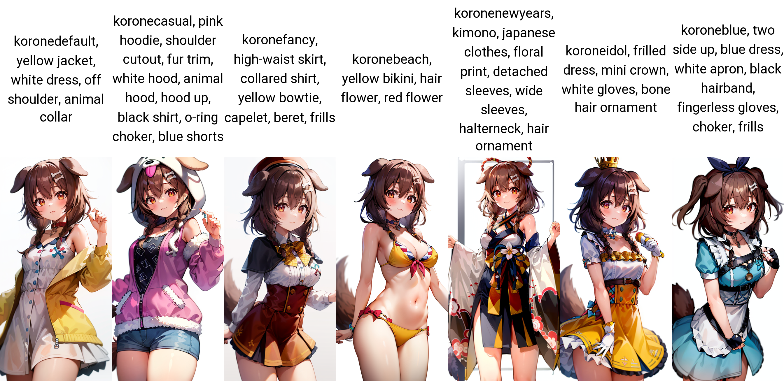 | 训练词汇 | koronedefault, yellow jacket, white dress, off shoulder, animal collar, low twin braids, bone hair ornament, dog tail已复制! koronecasual, pink hoodie, shoulder cutout, fur trim, white hood, animal hood, hood up, black shirt, o-ring choker, blue shorts, dog tail已复制! koronefancy, high-waist skirt, collared shirt, yellow bowtie, capelet, beret, frills, low twin braids, bone hair ornament, dog tail已复制! koronebeach, yellow bikini, hair flower, red flower, low twin braids, bone hair ornament, dog tail已复制! koronenewyears, kimono, japanese clothes, floral print, detached sleeves, wide sleeves, halterneck, bone hair ornament, hair ornament, dog tail已复制! koroneidol, frilled dress, mini crown, white gloves, thighhighs, asymmetrical legwear, bone hair ornament, dog tail已复制! koroneblue, two side up, blue dress, white apron, black hairband, fingerless gloves, choker, frills, dog tail已复制! |