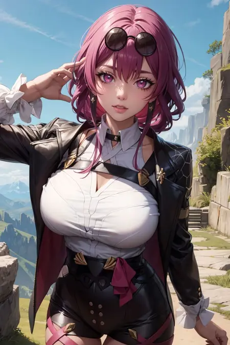kafka, eyewear on head, shirt, white shirt, jacket, pantyhose