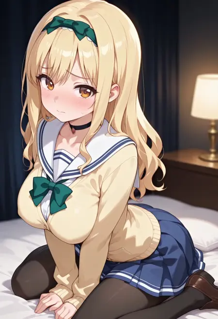 衣装: 黒いチョーカー、セーラー collar、黄色いカーディガン、長袖、緑のボウタイ、青いスカート、パンティーホース、茶色い靴