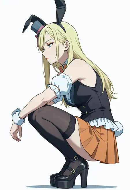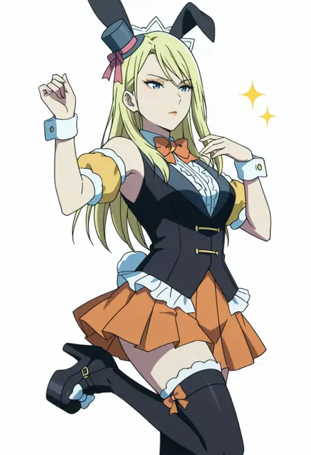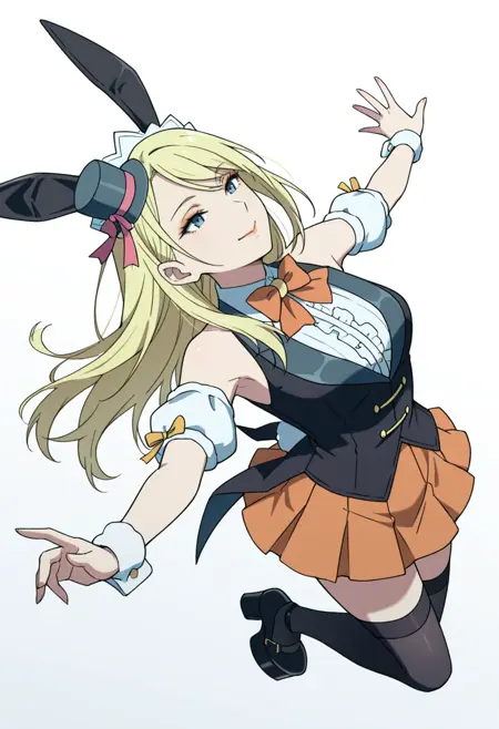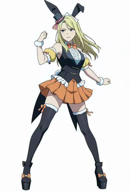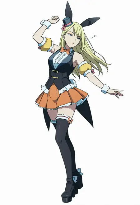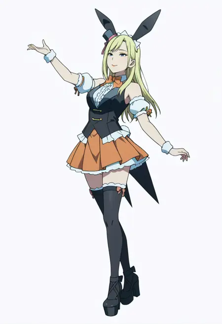 迷你高顶礼帽,黑色背心,衬衫,蓬松短袖,可拆卸袖子,腕带,橙色百褶裙,黑色过膝袜,荷叶边,蝴蝶结,厚底鞋,