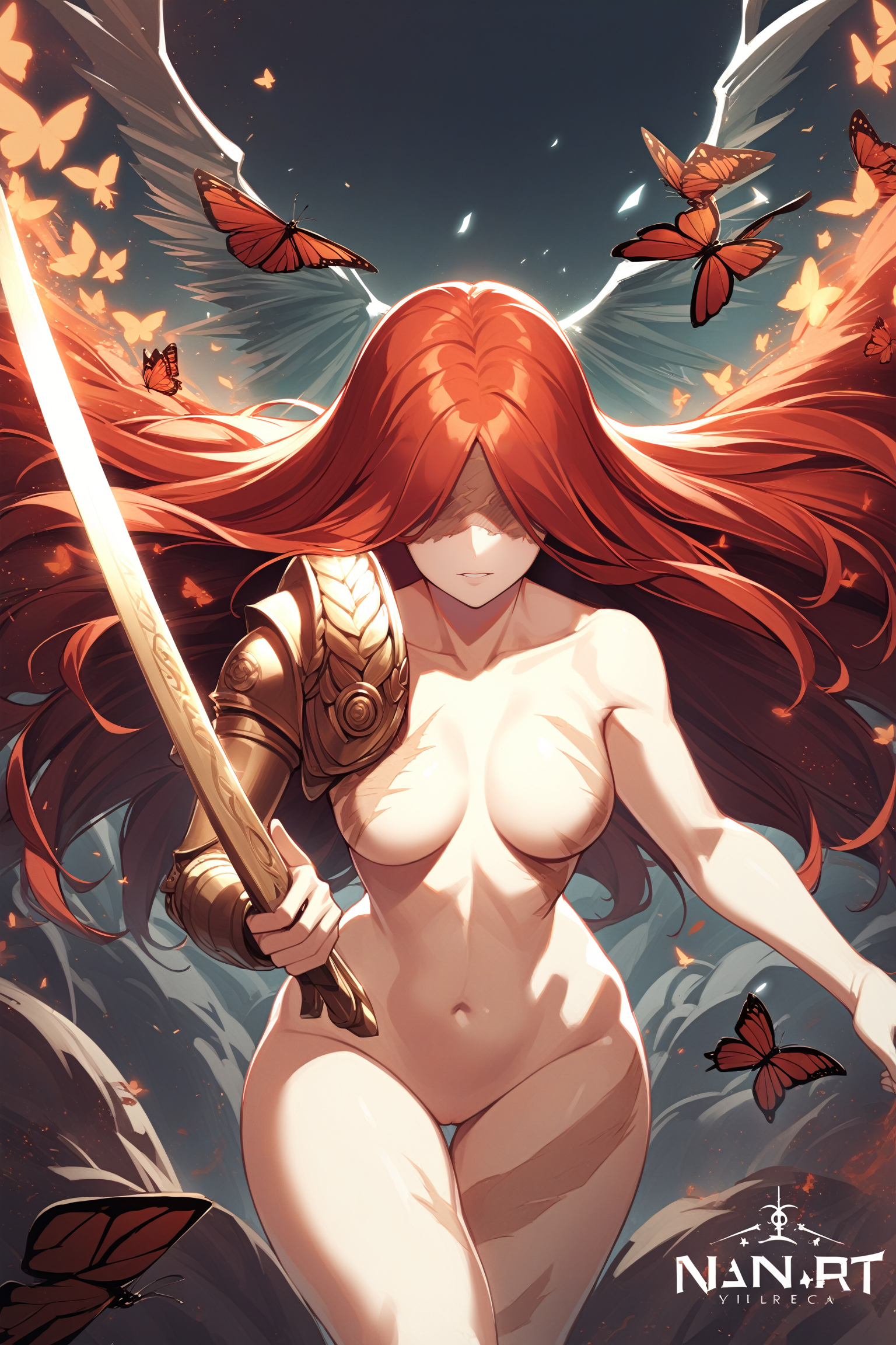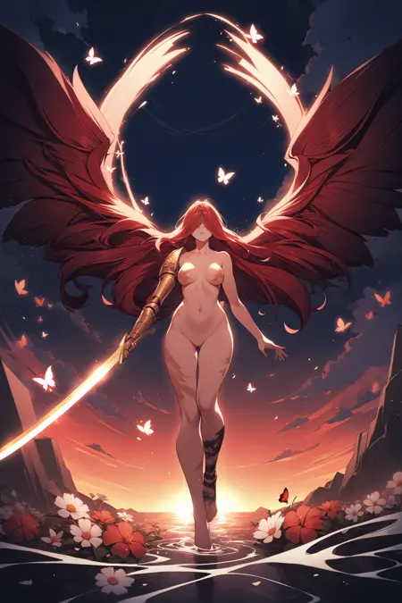 MaleniaRot, 빨간 머리, 눈 감음, 얼굴 흉터, 흉터, 완전히 벌거벗음, 가슴, 배꼽, 나비, 날개, 절단된 신체, 팔에 하나의 흉터, 하나의 기계 팔, 기계 다리