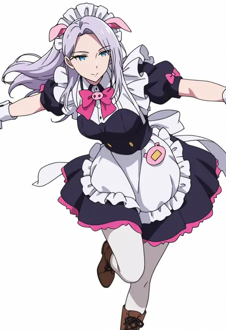 fake animal ears, pig ears,maid, maid headdress, maid apron, black dress, puffy short sleeves, white pantyhose, boots, cross-laced footwear, wrist cuffs, frills,pink bowtie,