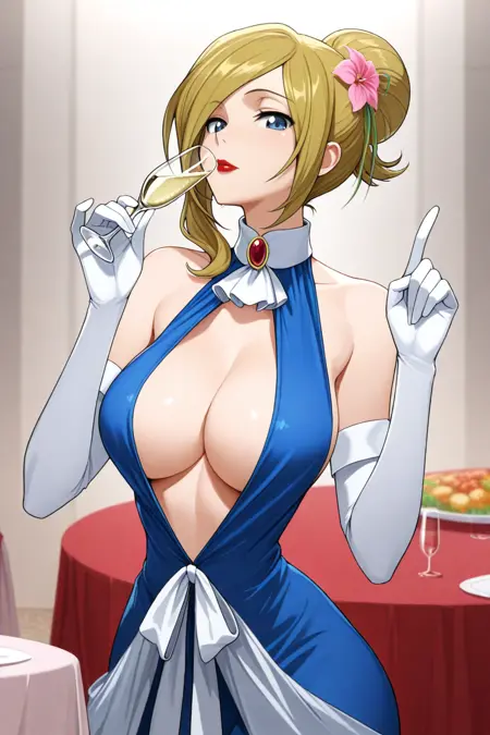 formal, blue dress, center opening, cleavage, large breasts, halterneck, white high collar, red brooch, ascot, white elbow gloves, dress ribbon, white ribbon, long dress, hair flower, pink flower