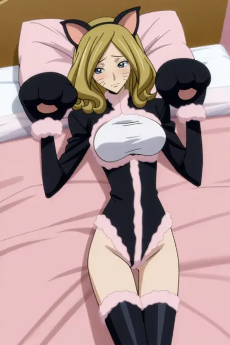 cat costume, black leotard, pink fur trim, framed breasts, white shirt, long sleeves, black cat tail, black paw gloves, black cat ears, fake animal ears, black thigh boots