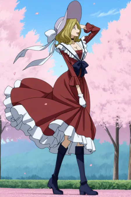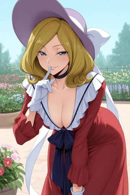 vintage clothes, red gown, cleavage, long sleeves, dress bow, dark blue bow, black choker, purple picture hat, hat bow, white bow, white gloves, frilled dress, dark blue knee boots