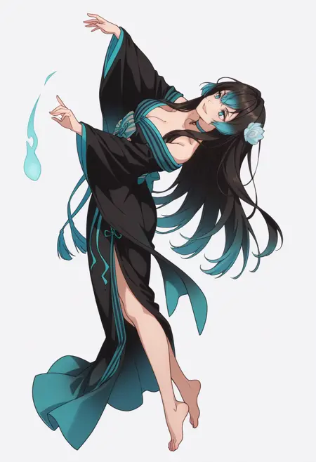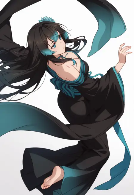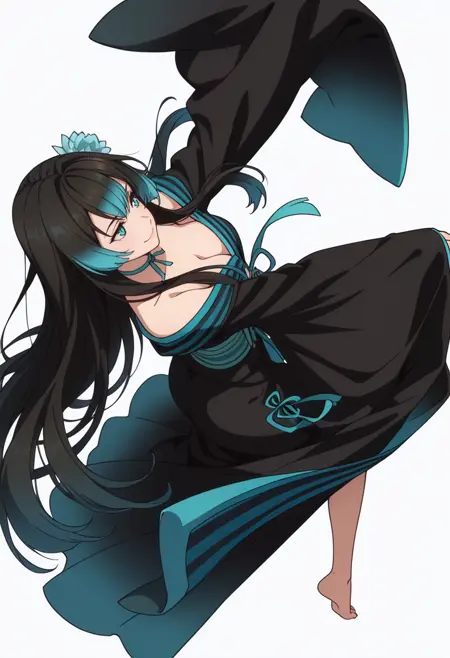 carmilla_cnr, 1girl,black hair,  gradient hair, long hair, bangs, blue eyes, hair ornament, hair flower,bags under eyes,