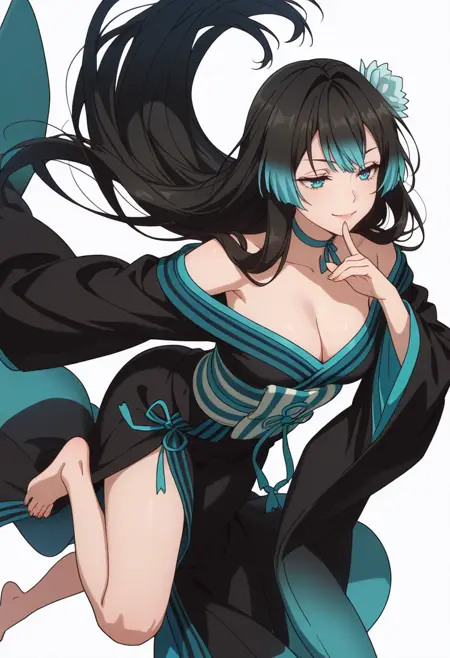 bare shoulders,  cleavage,black kimono, japanese clothes, sash, wide sleeves, long sleeves, off shoulder, barefoot,
