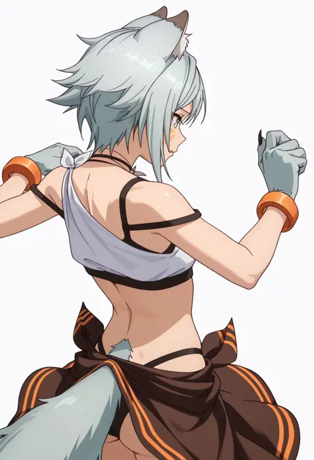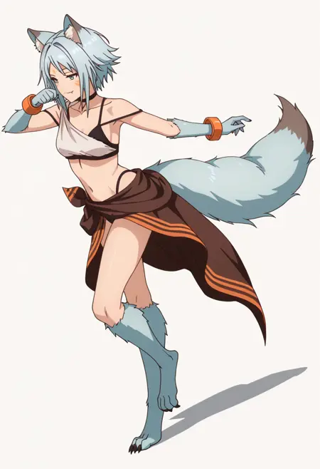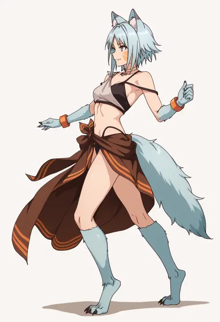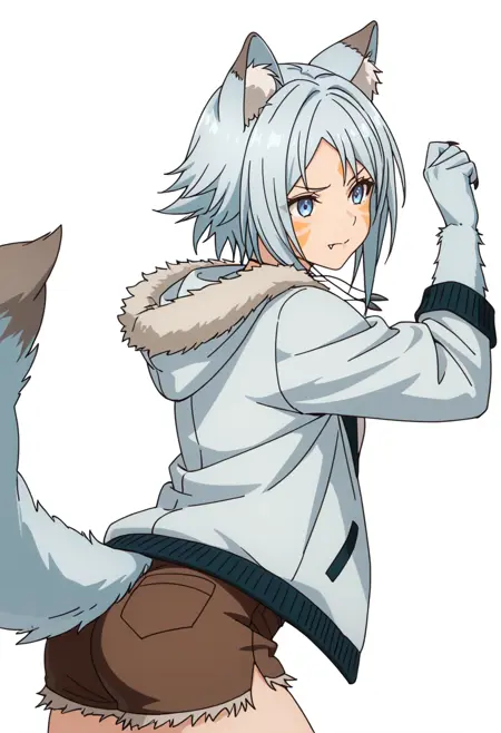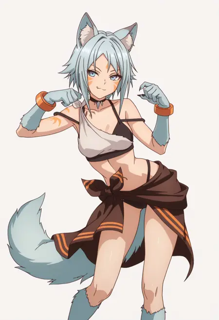 lynga_cnr, 1girl,blue hair,grey hair, short hair, blue eyes,fang out, animal ears, animal ear fluff, tail, animal hands, claws, facial mark,