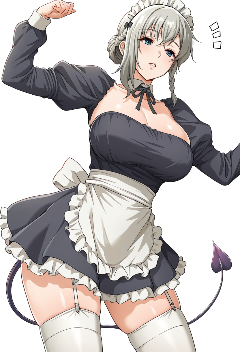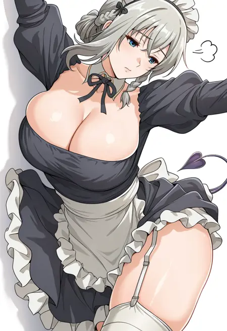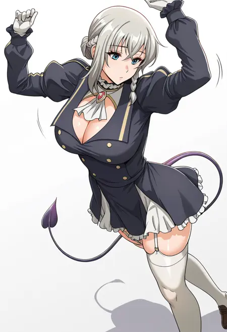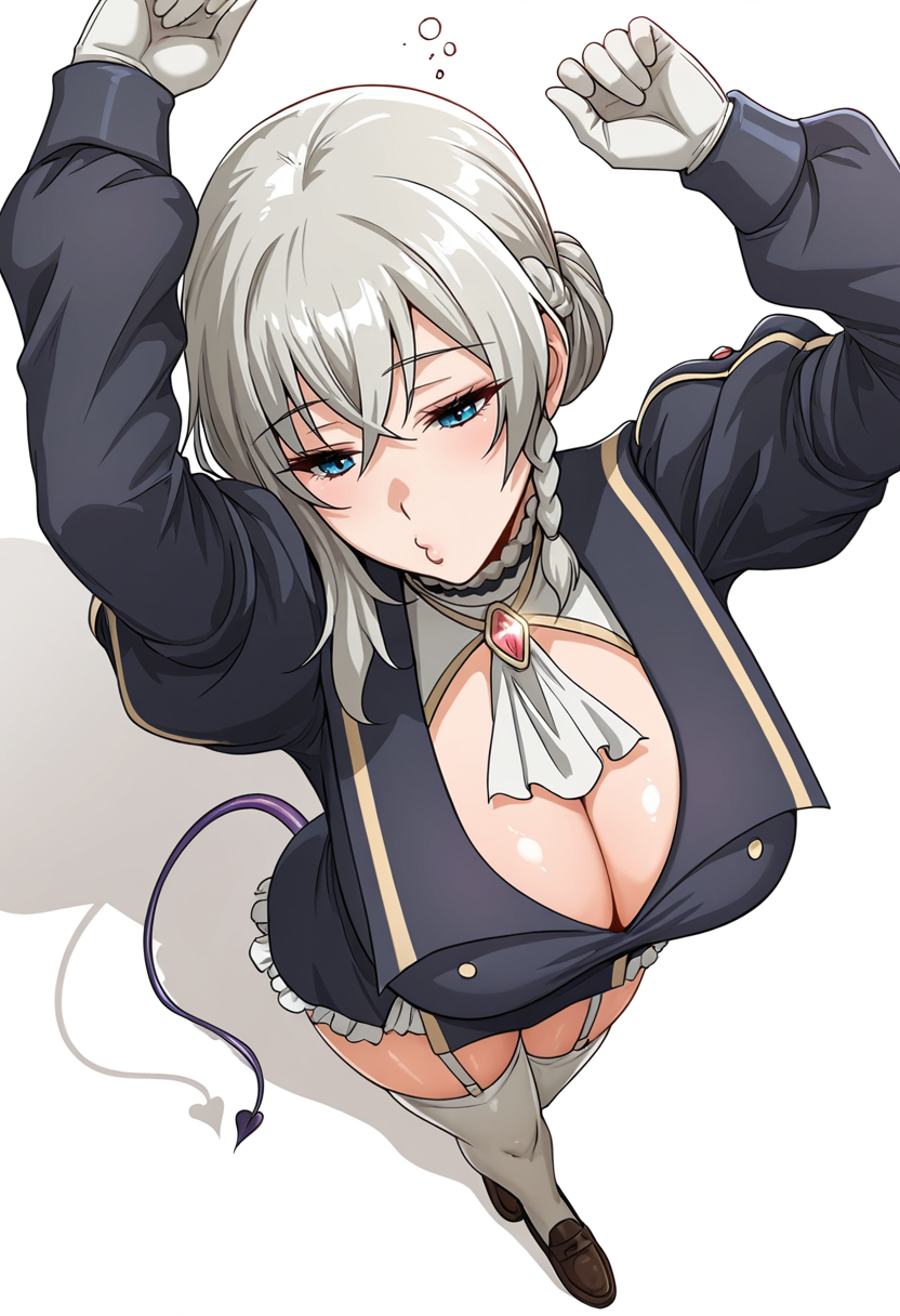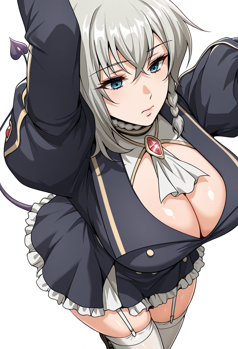 camilla_cnr, 1girl,grey hair, medium hair, braid, bangs, blue eyes,large breasts, skindentation, demon tail,