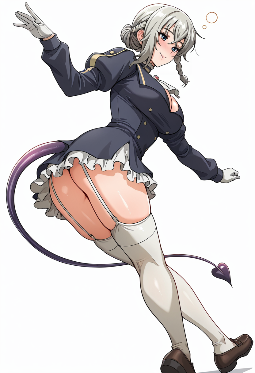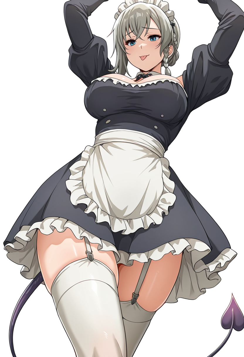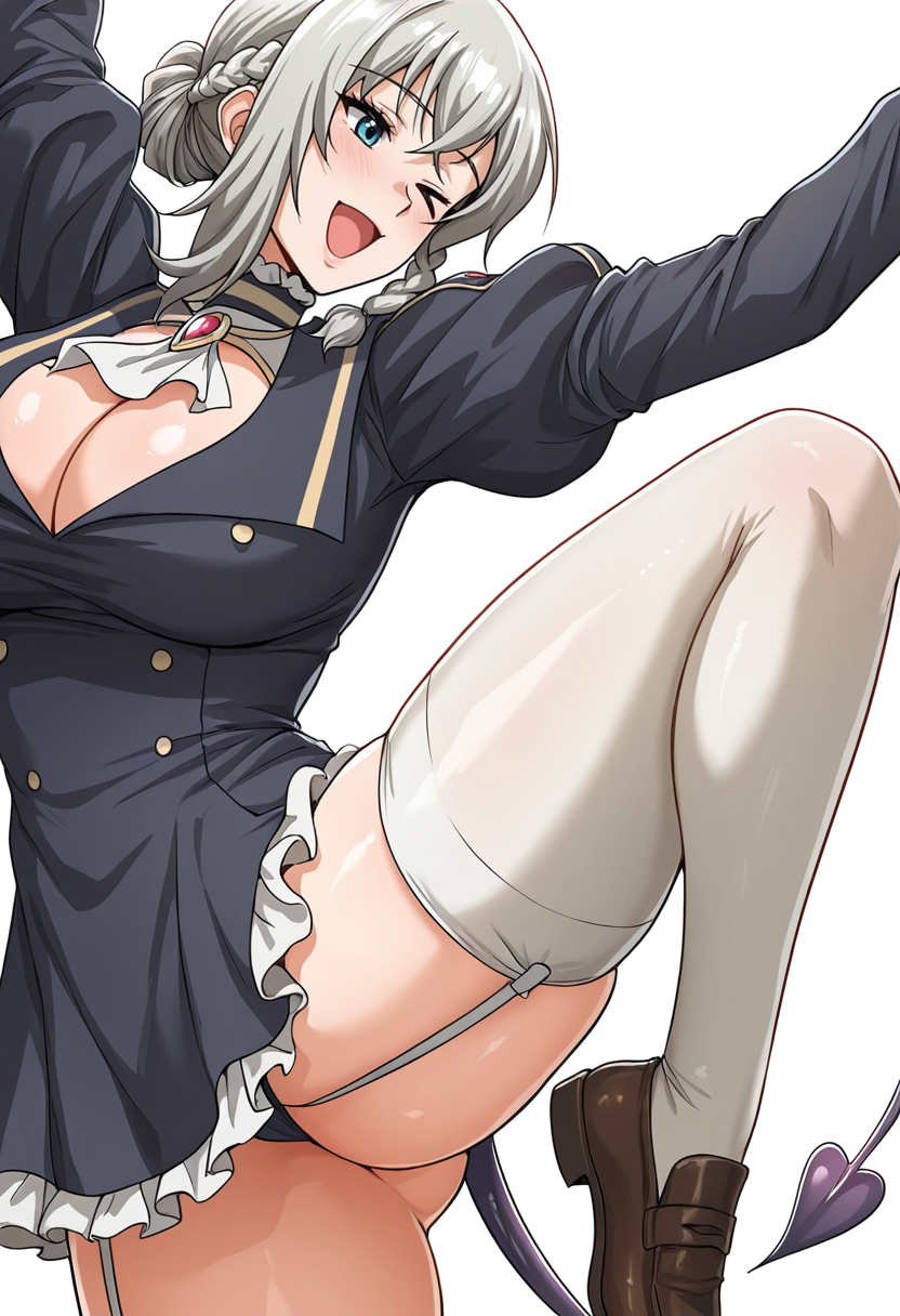 camilla_cnr, 1girl,grey hair, medium hair, braid, bangs, blue eyes,large breasts, skindentation, demon tail,